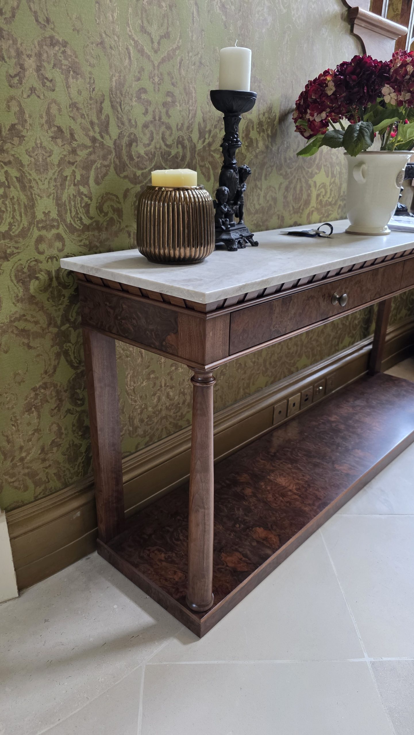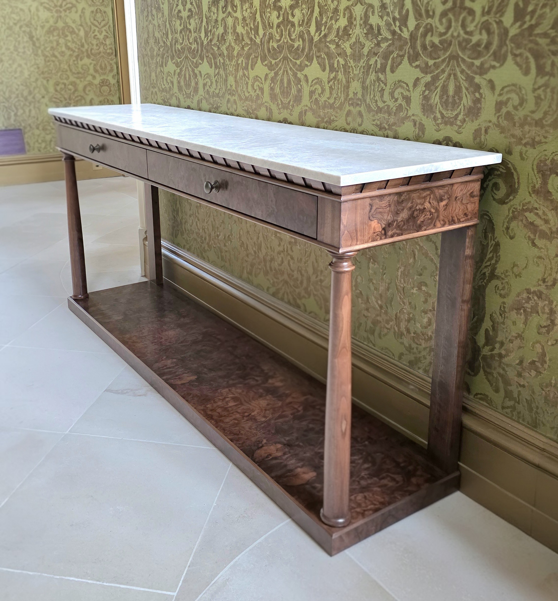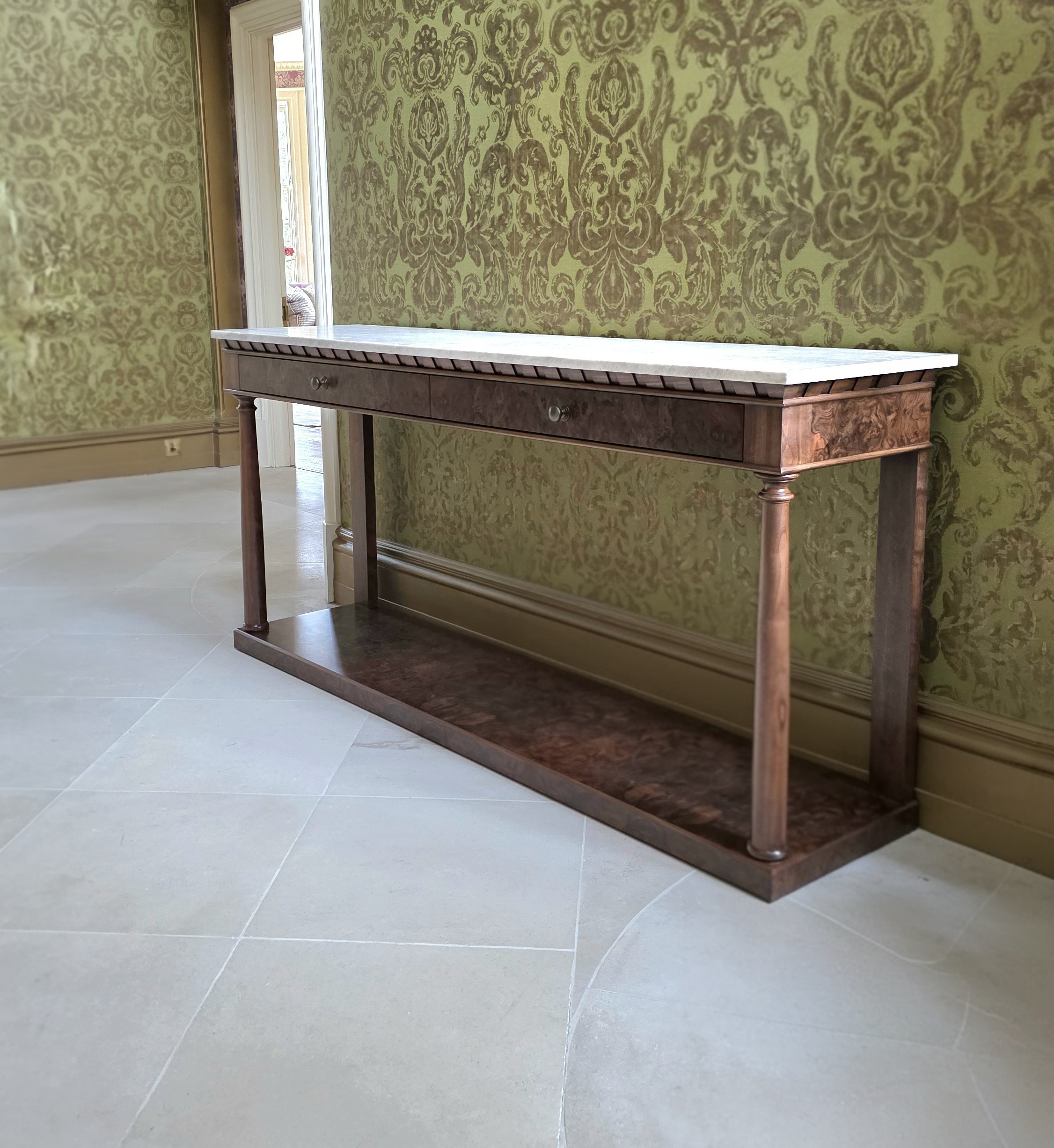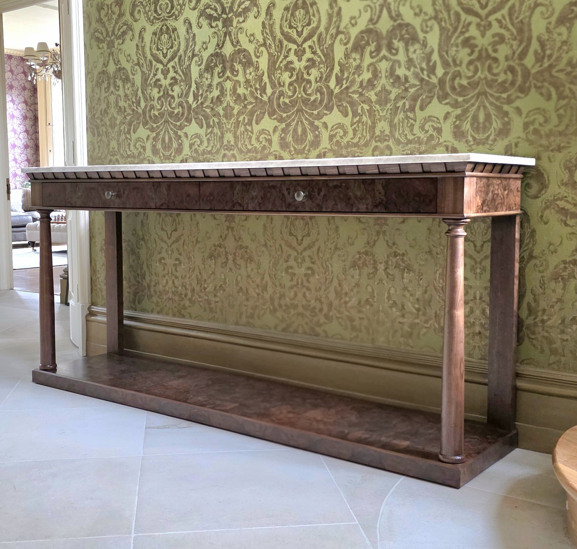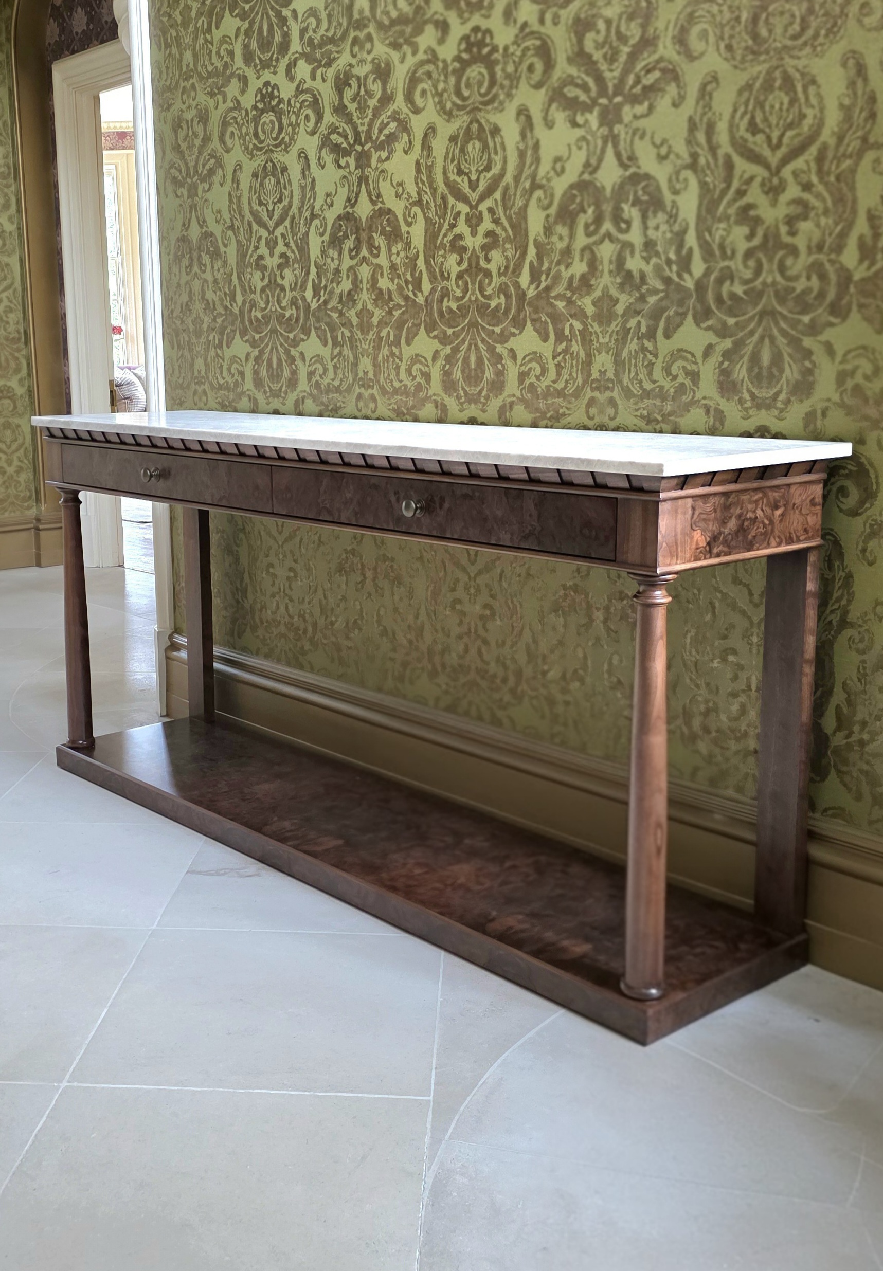 The Empire Hall Console is a stunning interpretation of the French Empire style, hand-crafted in English workshops by skilled artisans. Constructed in rich walnut with highly figurative burr walnut veneers, it features a striking Taj Mahal marble top that adds elegance and durability.