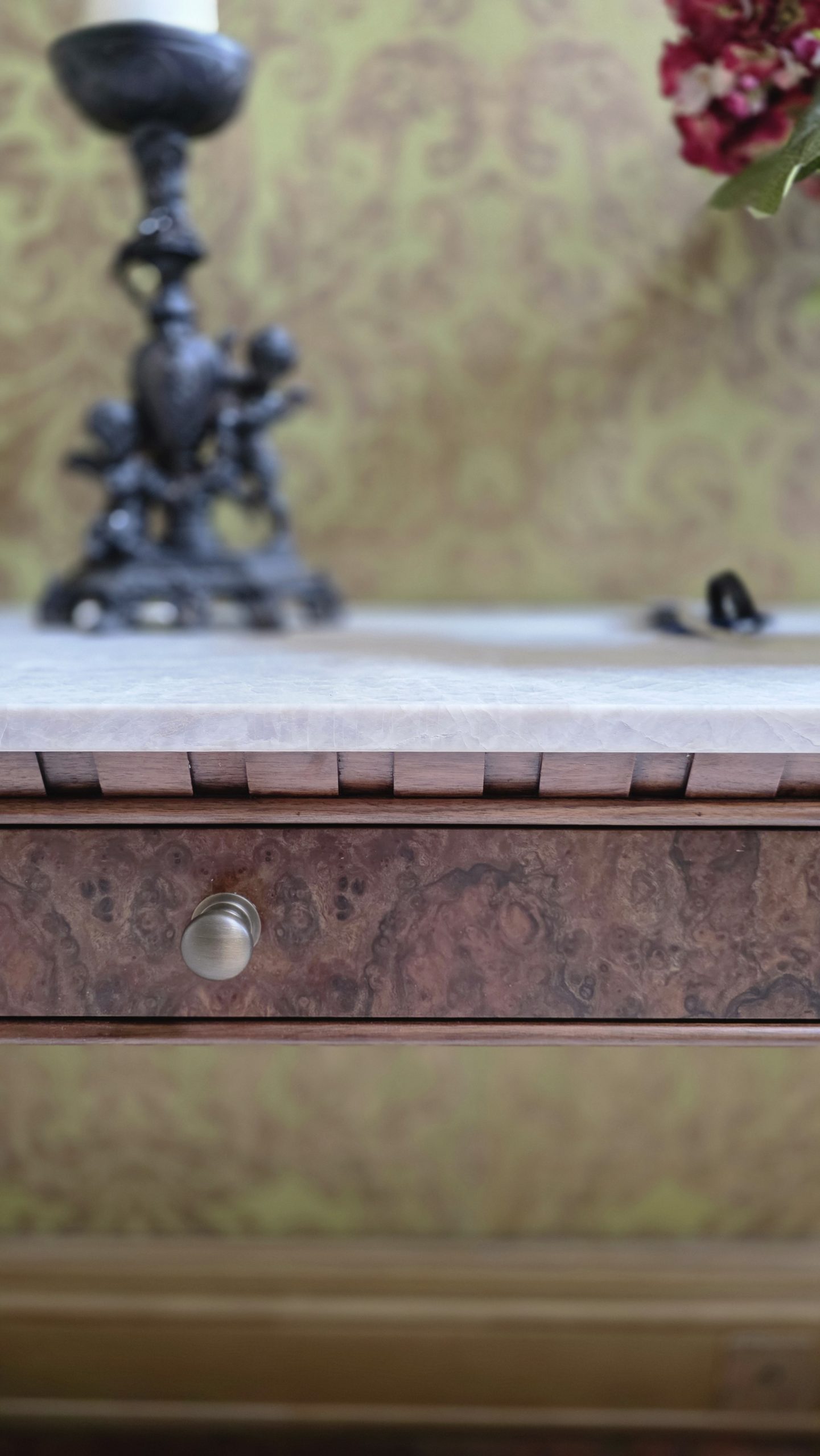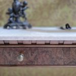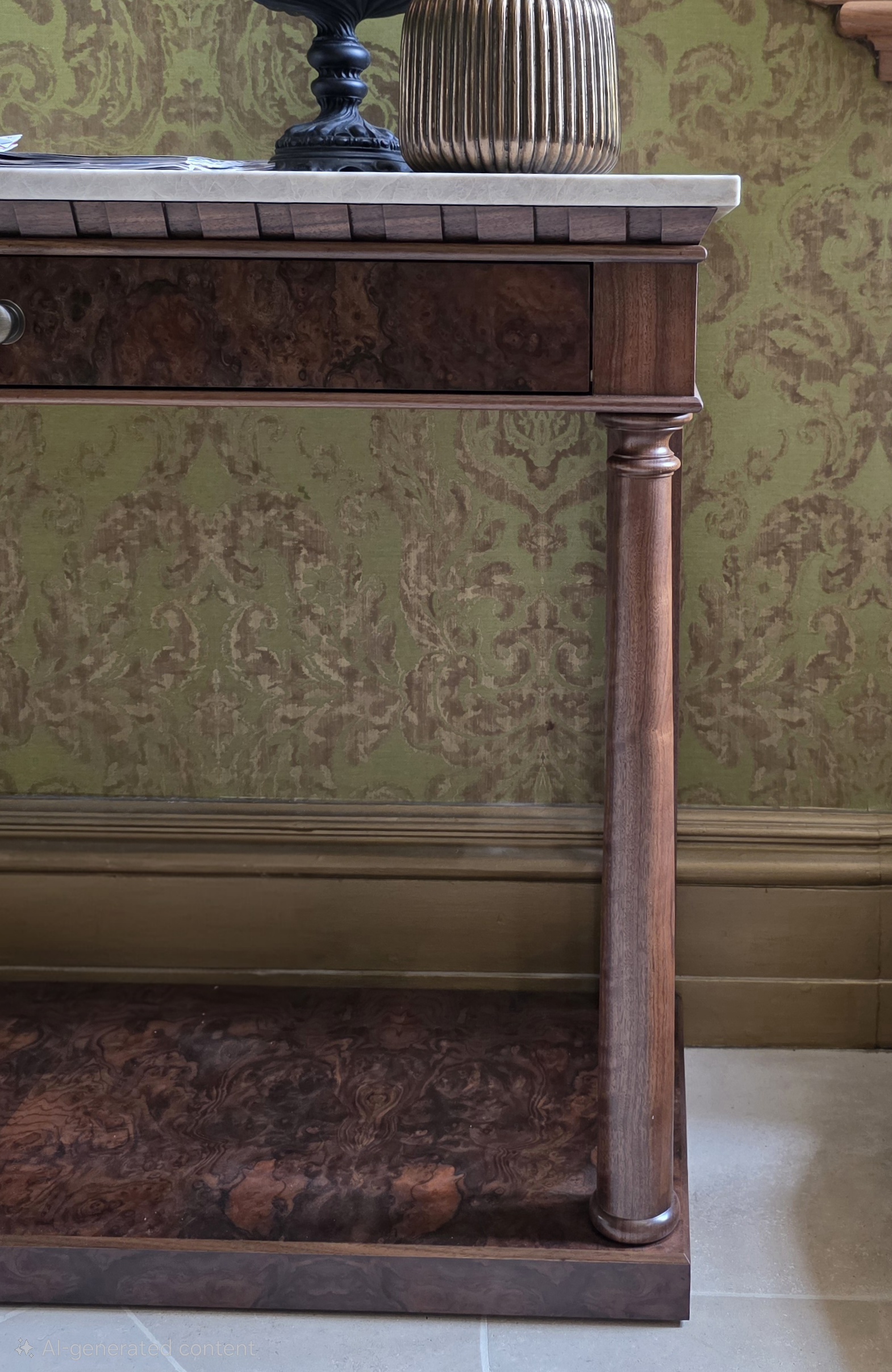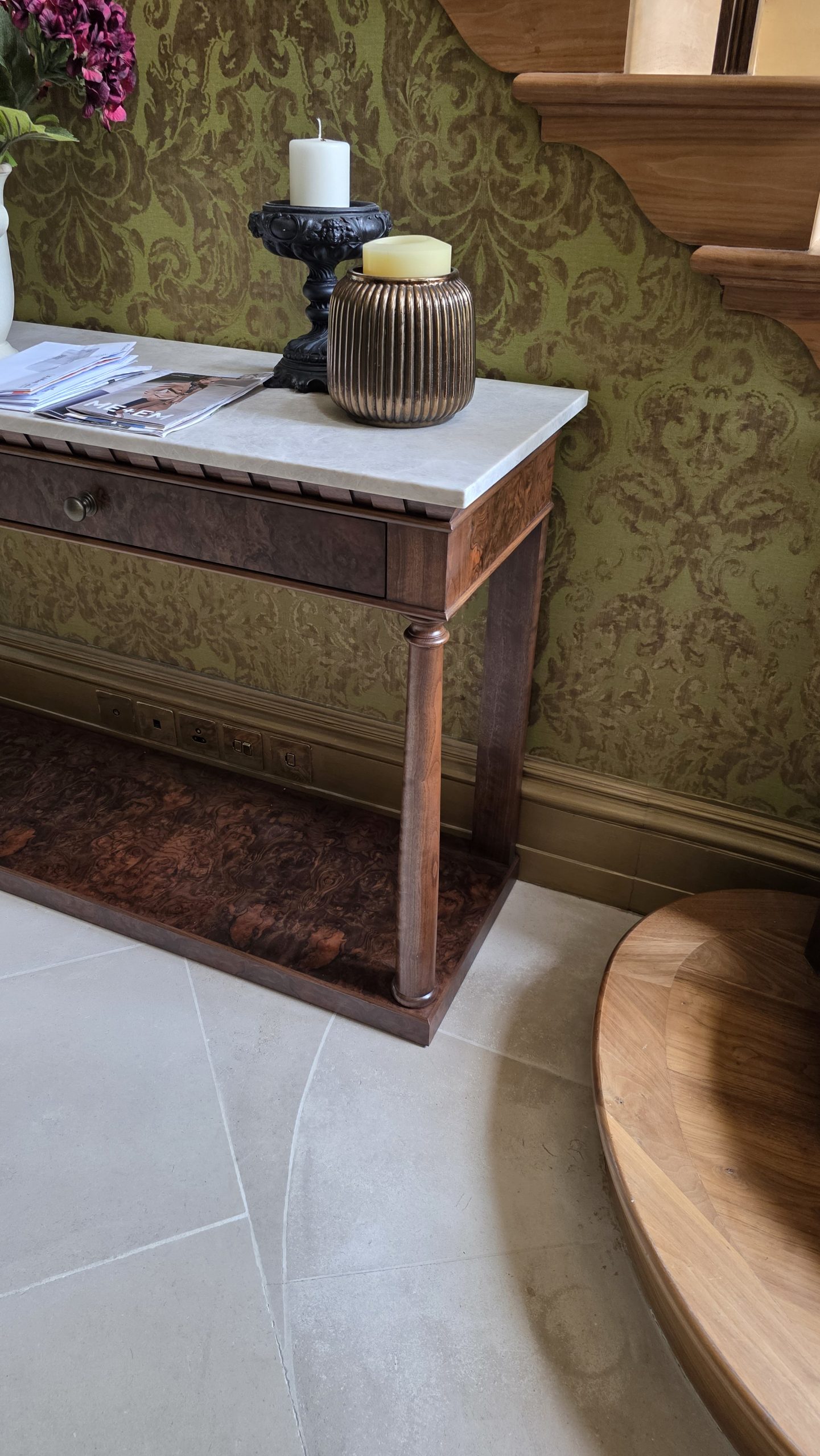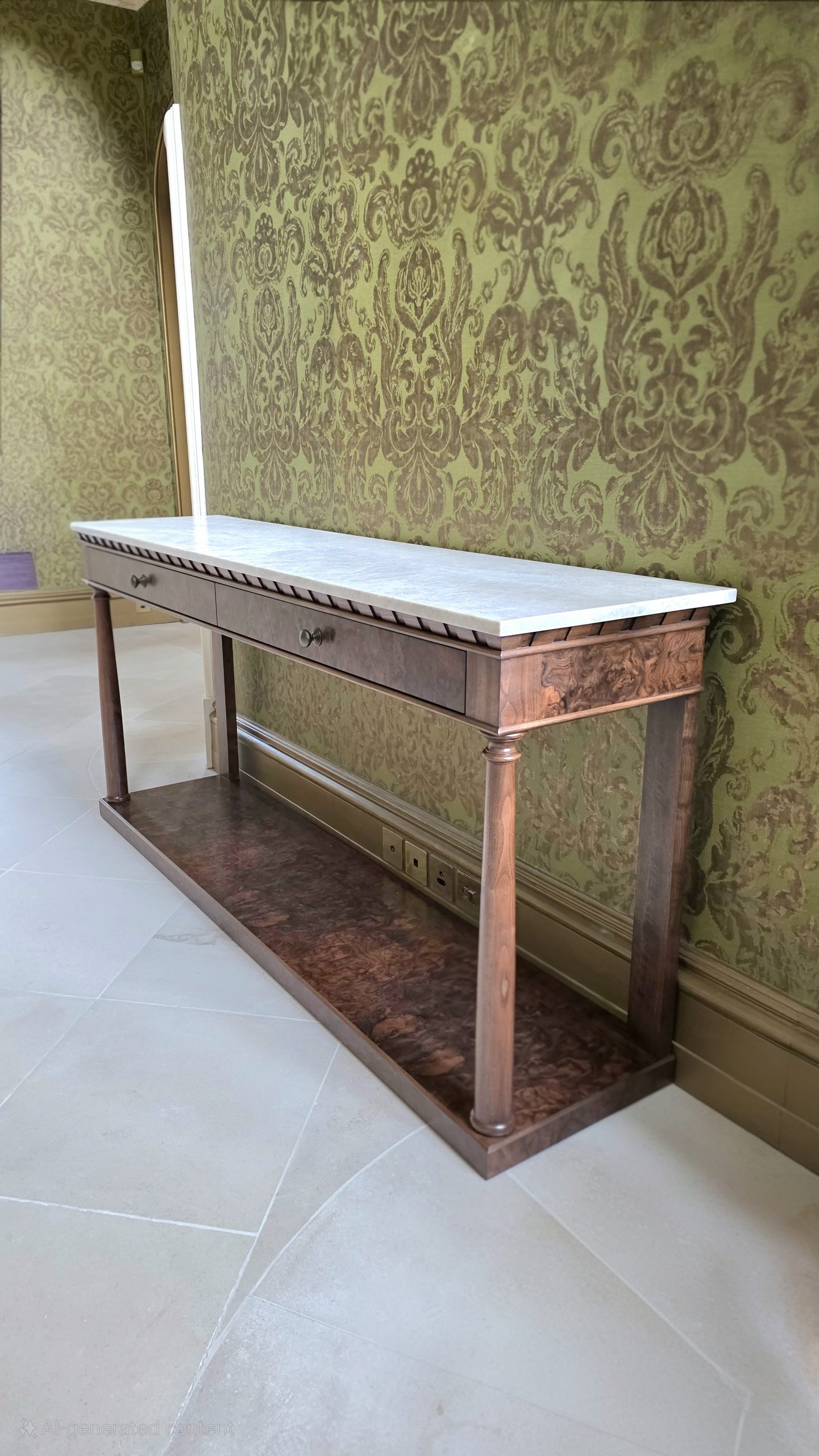 The Empire Hall Console is a stunning interpretation of the French Empire style, hand-crafted in English workshops by skilled artisans. Constructed in rich walnut with highly figurative burr walnut veneers, it features a striking Taj Mahal marble top that adds elegance and durability.