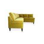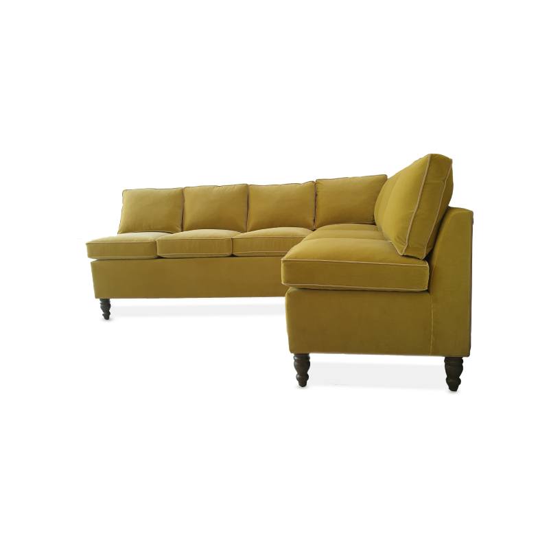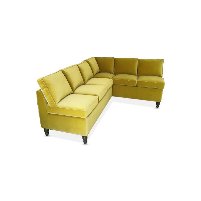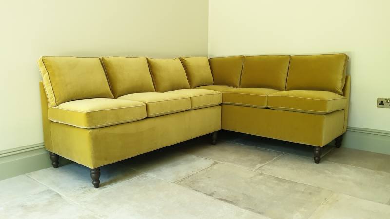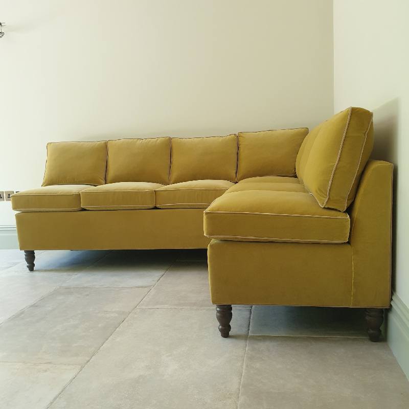 Here it is shown in Kirkby Ice II Cotton Velvet in colourway “Chartreuse” with the piping in Villa Nova Atil Velvet in Colourway “Palm”.
