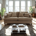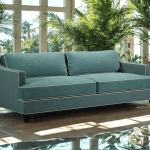 This elegant contemporary sofa  is beautifully comfortable.    The two large seat and back cushions are a joy to lounge on.  The design is the embodiment of our “Moditional” Style – it is super-modern and also traditional in construction – a nod to the 1920’s and the 50s but very 2020’s.   The all-round piping creates a sharp clean look.    We can upholster it in your own fabric or simply tell us what you would like and we will design it for you.
